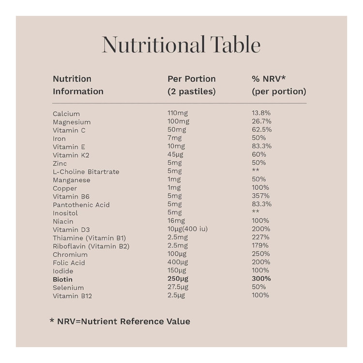 حاوی ویتامین های B2.B6.B5.B12.بیوتین.سلنیوم.زینک.ویتامین C.ویتامینD3 و … است